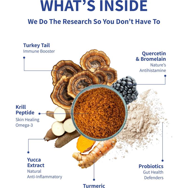 The turkey tail mushroom is particularly powerful because it regulates immune response—whether your dog's immune system is overreacting to pollen, chicken protein, or flea saliva, it helps restore balance. The probiotics heal leaky gut (a major contributor to all types of allergies), while quercetin acts as a universal natural antihistamine.