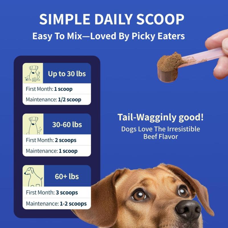 The beef flavor is formulated to be highly palatable - even picky eaters love it. Most dogs think they're getting a treat. Simply mix one scoop with their regular food. If your dog is extremely picky, you can start with a half scoop mixed in something they love (like a bit of peanut butter) to get them used to it.
